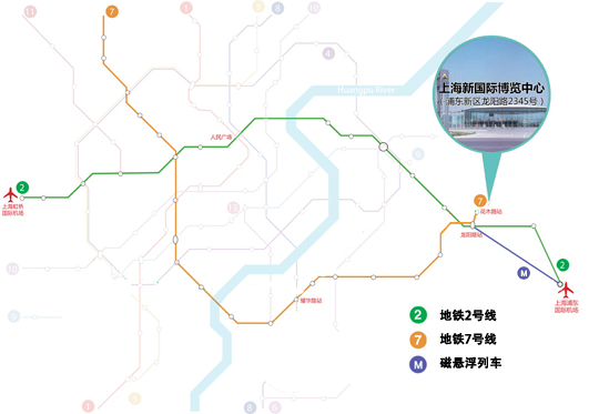 • 上(shang)海新國際博(bo)覽中心戰略(luè)性地坐落于(yu)浦東經濟開(kāi)發區,距離📐上(shàng)海新國際博(bo)覽中心600米處(chù)有一大型交(jiāo)通📞樞紐站,即(jí)龍陽路站🔱(位(wèi)于龍陽路上(shàng)),包括多條路(lù)公交線路起(qǐ)點站、軌道交(jiao)通2号線龍🔞陽(yang)路站、軌道💘交(jiāo)通7号線龍陽(yáng)路站以及磁(ci)懸浮列車終(zhong)點站。從2号❌線(xiàn)龍陽路站步(bù)行到展館大(dà)約需10分鍾;從(cóng)7号線花木👣路(lù)站步行到展(zhan)館大約1分鍾(zhong)。